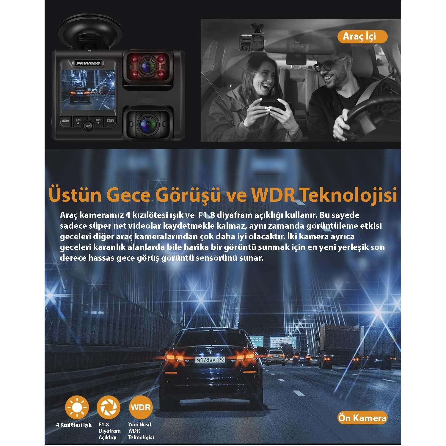 Karanlıkta Sürüş Yapmak Artık Endişe Verici Olmak Zorunda Değil! Pruveeo Araç Kameramız, 4 Kızılötesi Işığı ve F1.8 Diyafram Açıklığı Sayesinde Sadece Süper Net Videolar Kaydetmekle Kalmaz, Aynı Zamanda Görüntüleme Etkisi Geceleri Diğer Araç Kameralarından Çok Daha İyi Olacaktır.