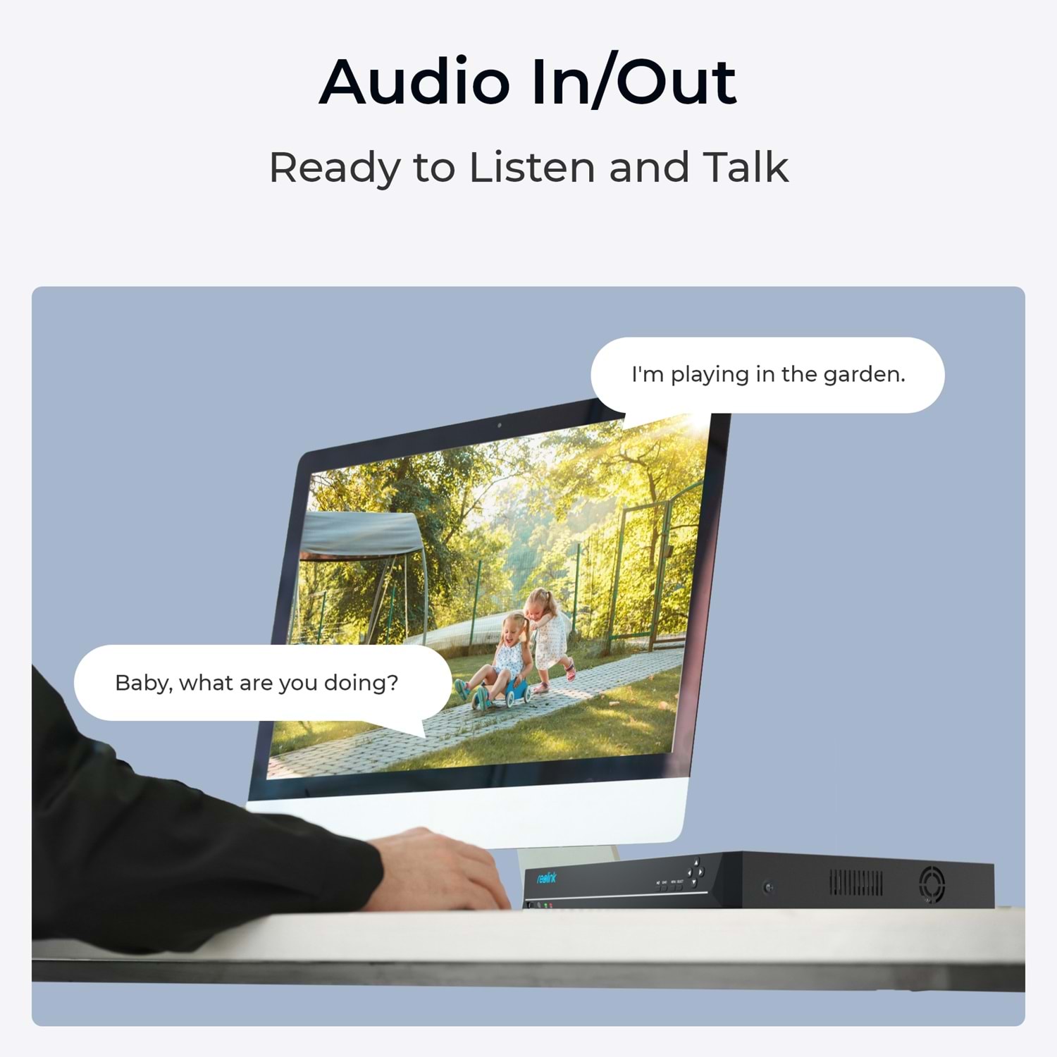 Yerleşik ses bağlantıları sayesinde NVR üzerinden iki yönlü iletişim kurabilirsiniz. Şüpheli ziyaretçilere anında yanıt verin veya yerinde kişilerle canlı iletişim sağlayın.